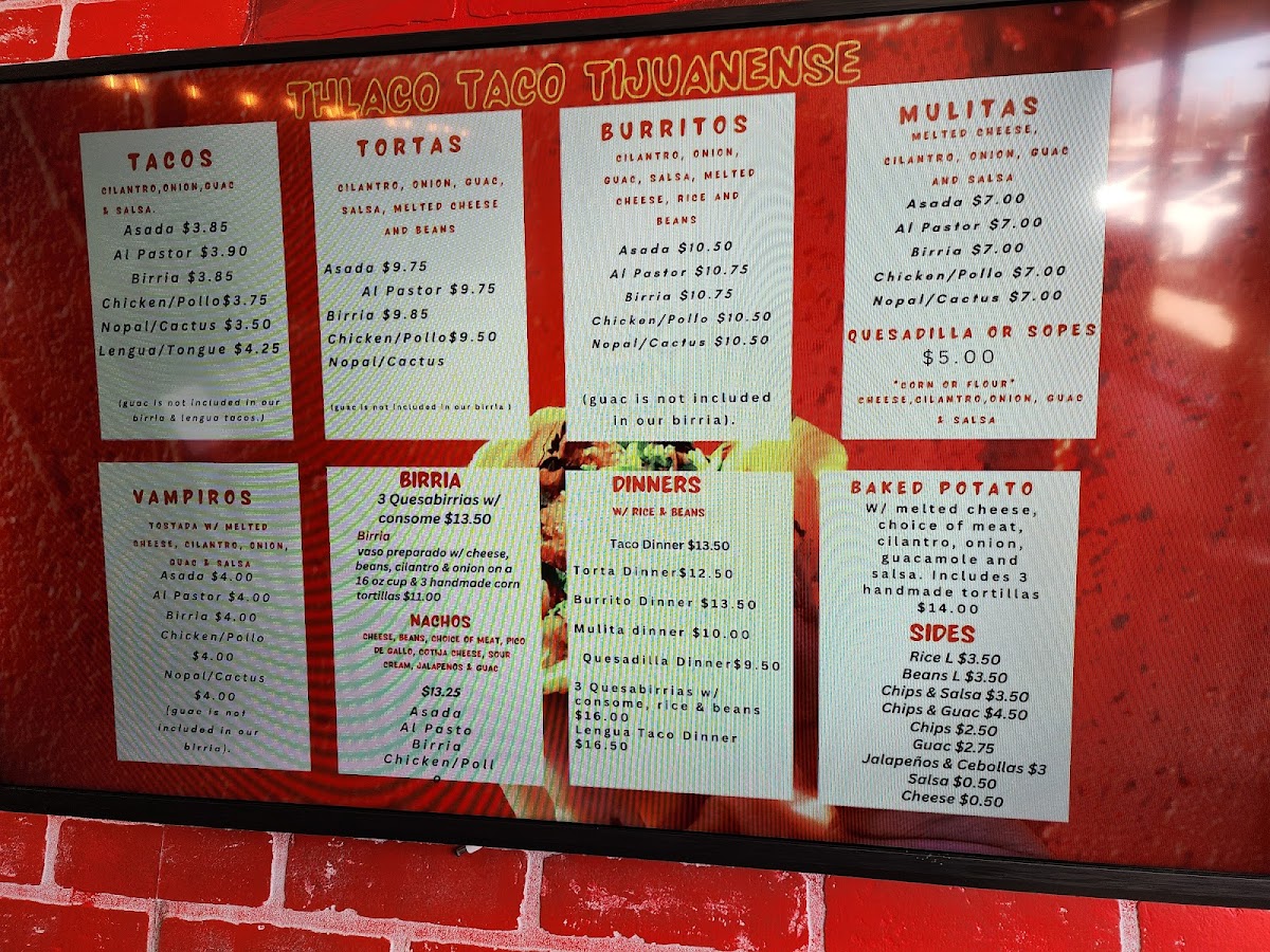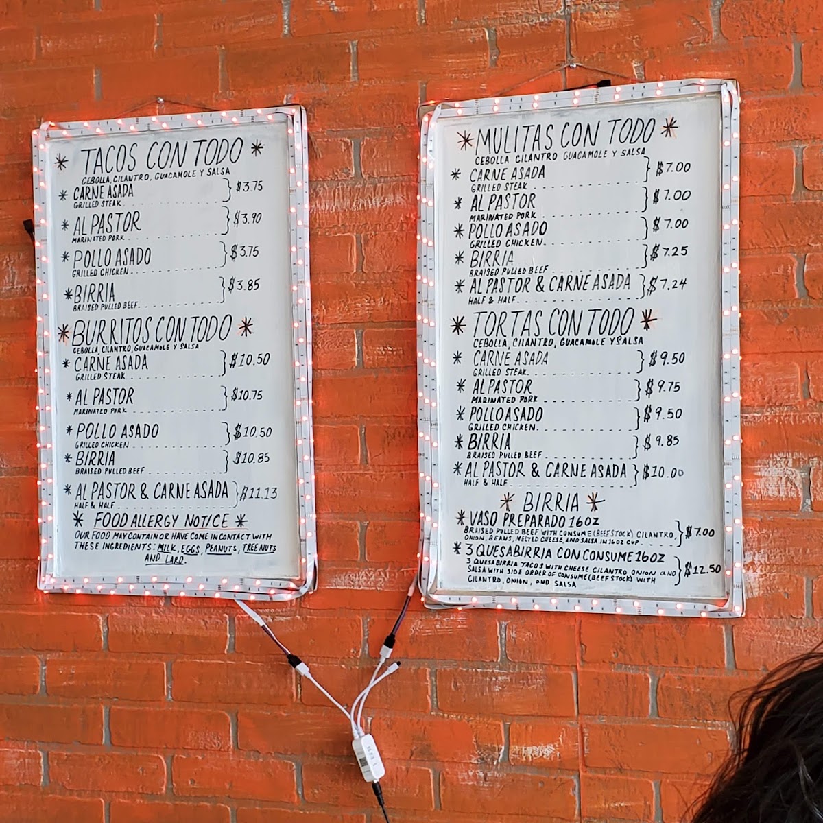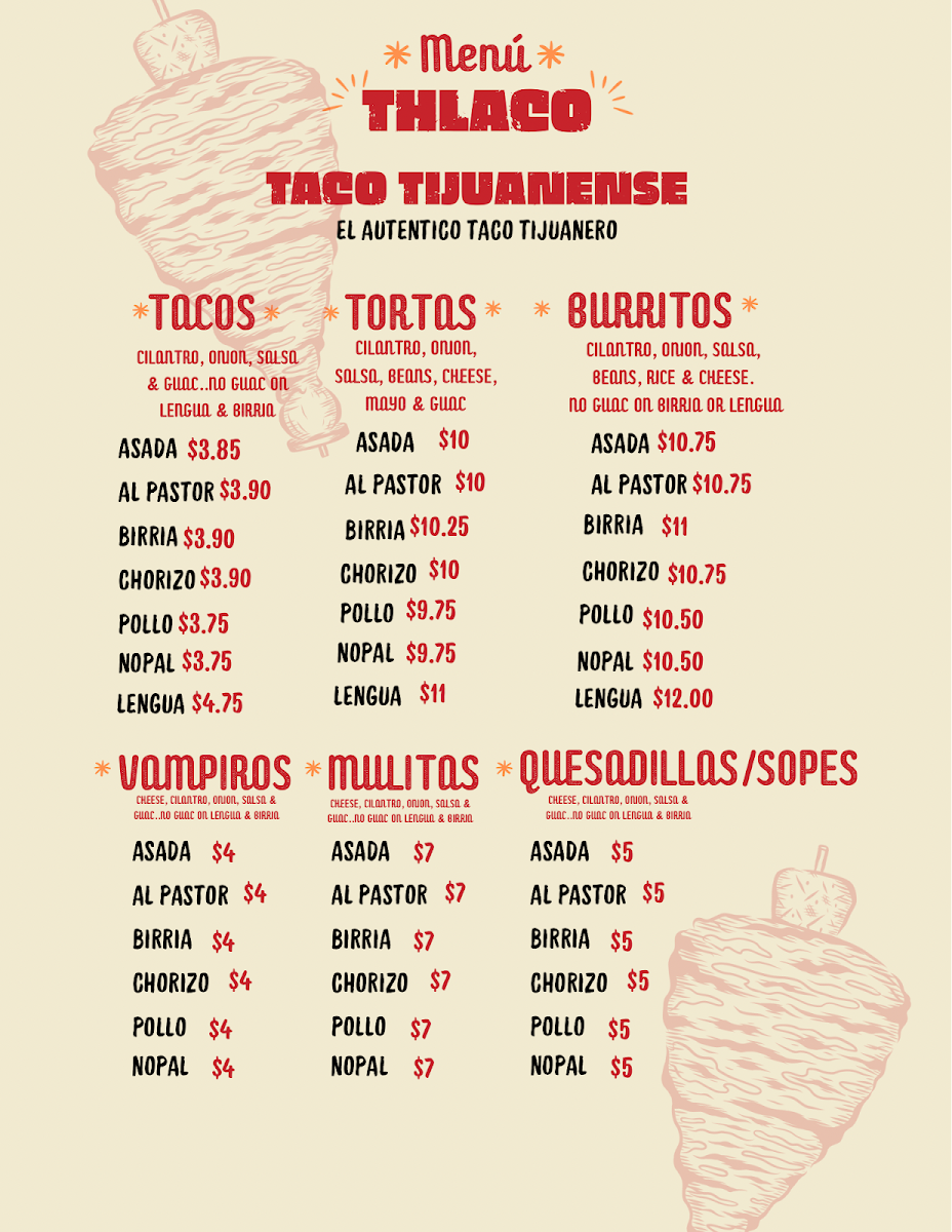 (Taco Dinner comes with 3 tacos rice and beans) -Asada taco comes with cilantro, onion, salsa and guac. -Al pastor taco comes with cilantro, onion, spicy salsa, avocado cream and pineapple. -Birria taco comes with only cilantro and onion. -Grilled chicken taco comes with cilantro, onion, salsa and guacamole. -Cactus taco comes with cilantro, onion, beans, salsa and guac. -Quesabirria taco comes with melted cheese, cilantro and onion.